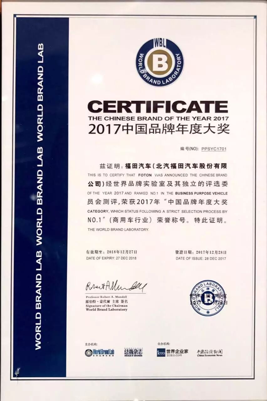 经过激烈的角逐,福田汽车品牌成功入选2017 年中国品牌年度大奖——商用车行业 NO.1的名单,这是全球专业评审专家对福田汽车的高度肯定和认可,也是福田汽车作为自主品牌多年持续良好经营取得的硕果。