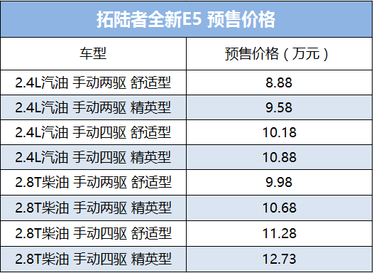 福田乘用车旗下全新换代升级皮卡车型拓陆者全新E5正式开启预售,预售价格区间为8.88万元—12.73万元,拓陆者全新E5共推出8款车型,搭载2.4L汽油和2.8T柴油两款动力,新车计划4月12日在北京全国上市。预售价格如下: